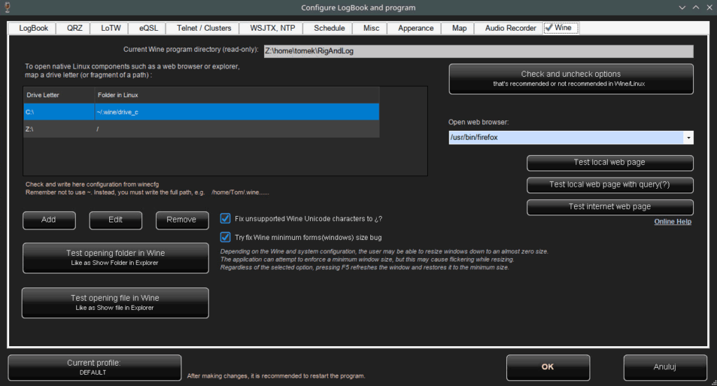 • Some errors may occur. Since Wine emulates Windows, it’s not 100% compatible. For example, in one of the dialogs, a text containing the Polish letter Ł repeatedly appeared — and although it worked fine elsewhere, in that specific place it caused Wine to freeze. In general, my impression is that Linux constantly needs a little “push” to move forward — copy-paste issues, network browsing quirks, etc., always something to tweak in the console to make it work. That’s just my personal opinion as a long-time Windows user after briefly exploring the topic. No offense intended. 😜