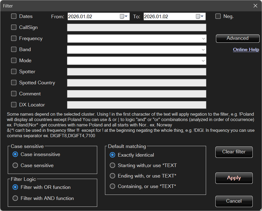 Polska|Nor*– select countries named Polska and all countries starting with Nor (e.g. Norwegia, Norway).!Polska|!Nor*– select countries other than Polska and all countries not starting with Nor.SP4*|SP5*– all callsigns starting with SP4 or SP5.SP4*&!*ABC– all callsigns starting with SP4 and not ending with ABC.