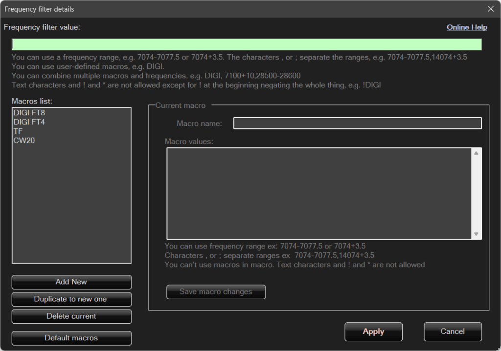 Do not confuse the upper frequency filter field with the macro list below.