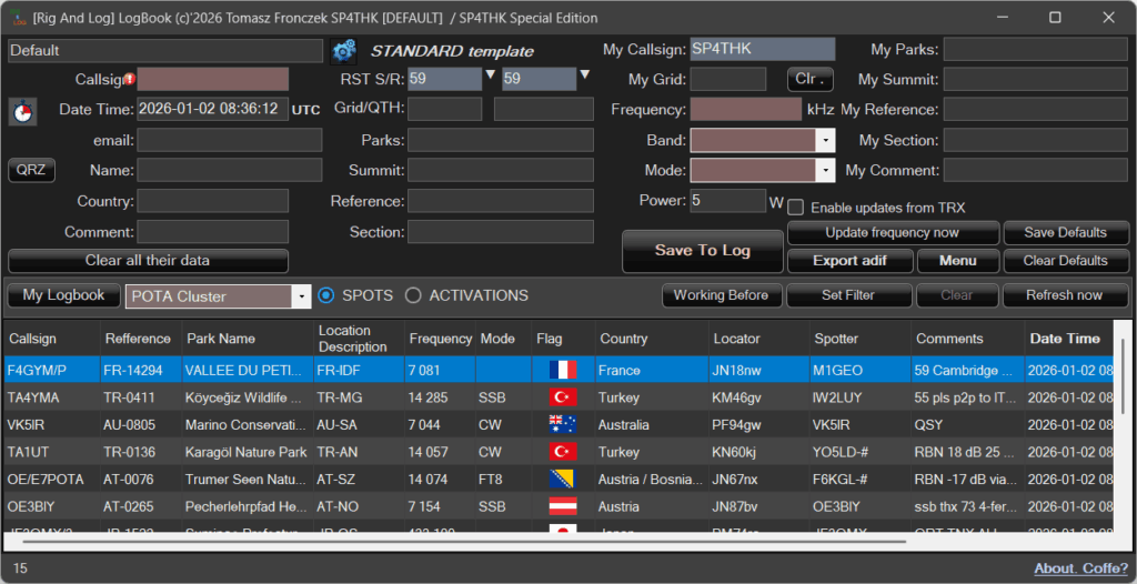 We run the logbook from Menu->Log Book with the POTA/SOTA cluster….
