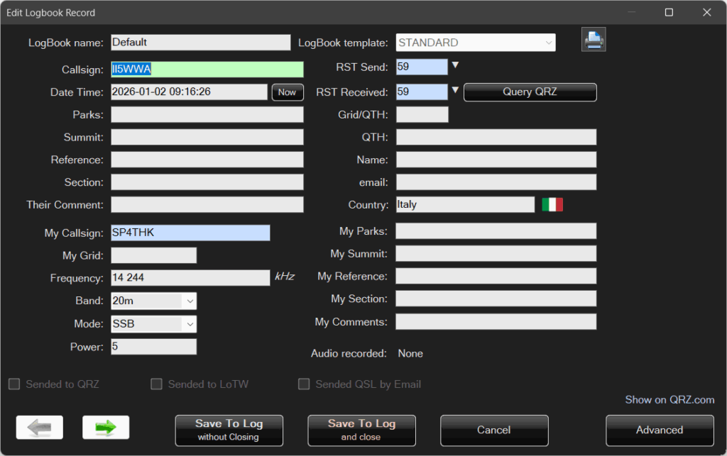 Logbook Template – the following templates are available: Standard, POTA, SOTA, WWFF, Field Day.