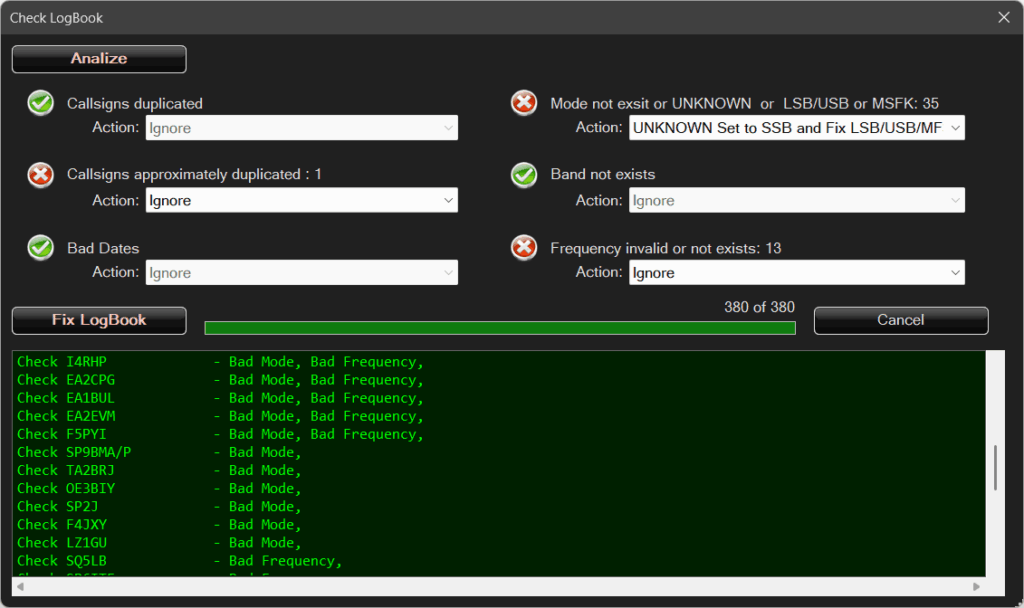 Check current Logbook – checks whether there are any errors in the logbook and allows you to choose how they should be fixed: