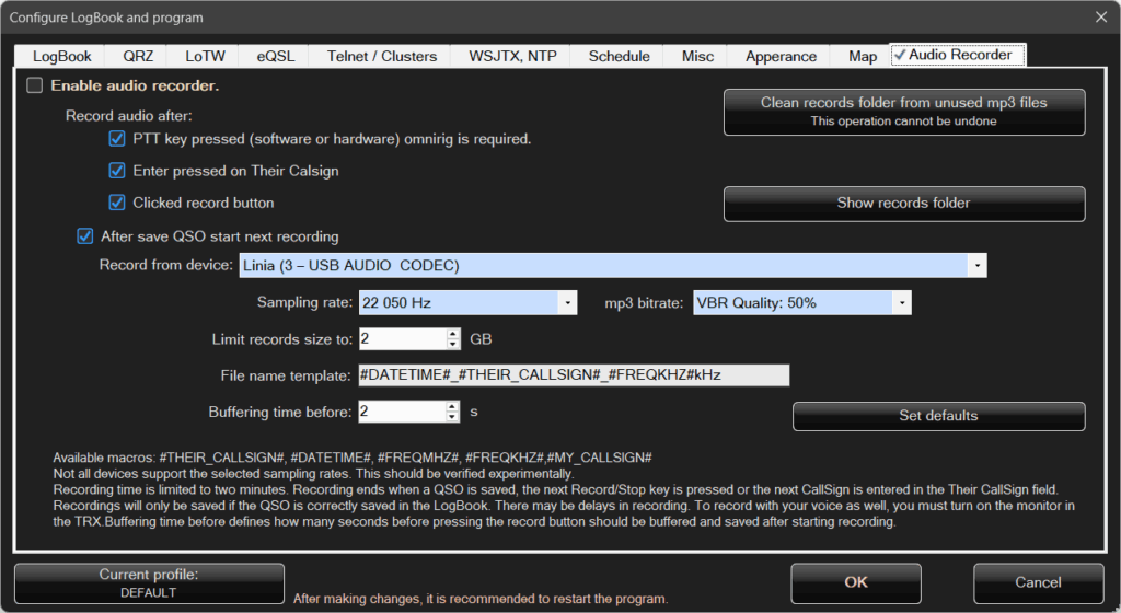 To enable recording, click Enable recording function — the program will start buffering audio data.