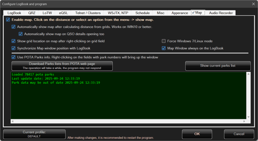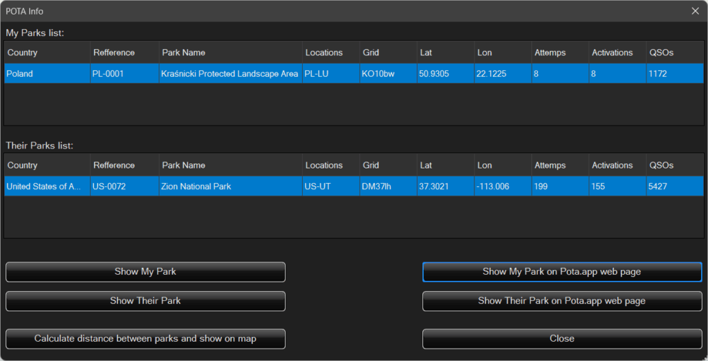 Park data is downloaded once and stored locally on disk. If a long time has passed, it is recommended to update it by clicking Download park list from POTA.