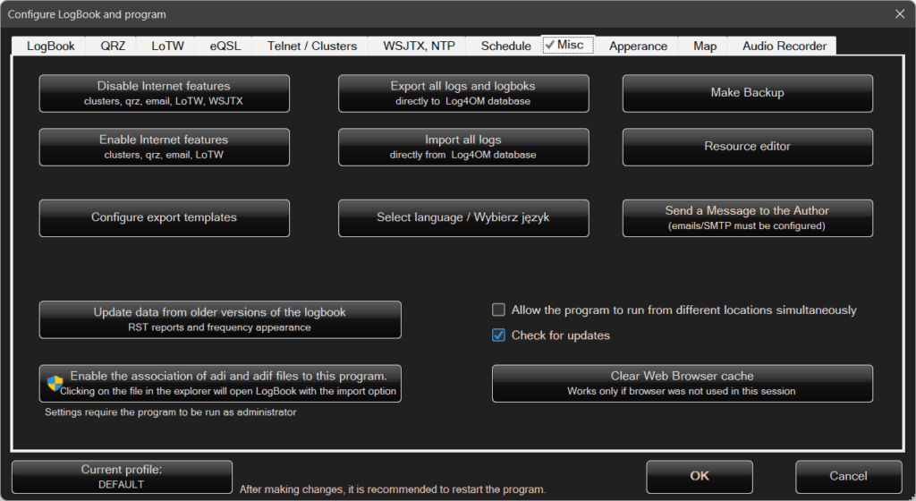Enable ADIF file association – this option enables file association in Windows, so that double-clicking any .adi file will start the Logbook and open the import dialog automatically.