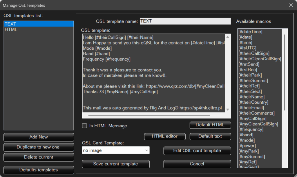 You can design your own QSL card and send it to correspondents, provided that their e-mail addresses are available — either entered during the QSO and saved, or retrieved from the QRZ database.