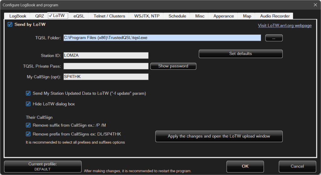 To be able to send logs via LoTW, the TQSL application must be installed.