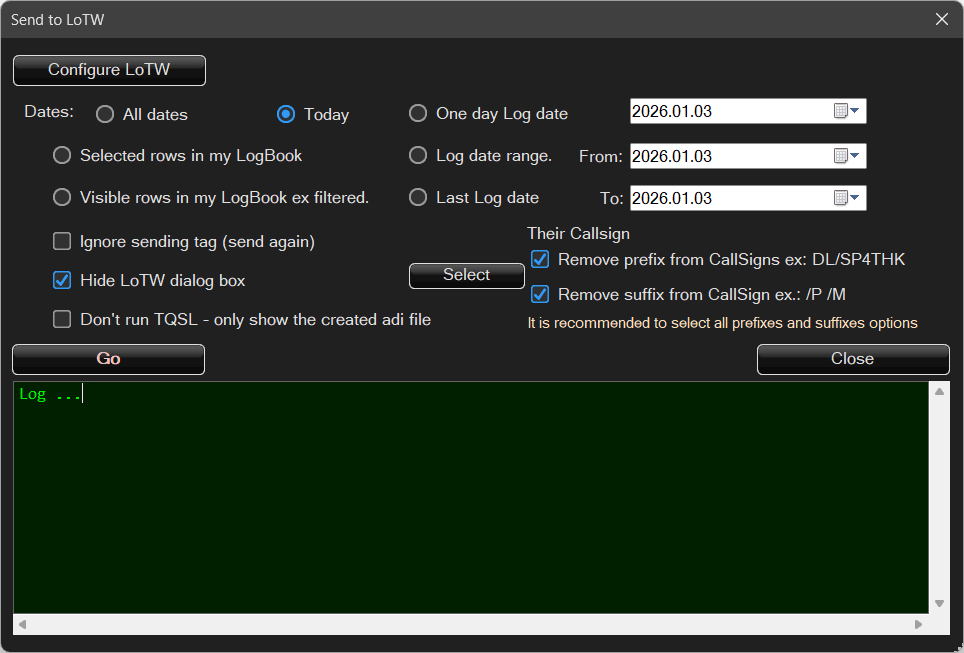 For these reasons, options are provided to strip prefixes and suffixes, both from the correspondent’s callsign and from your own callsign.