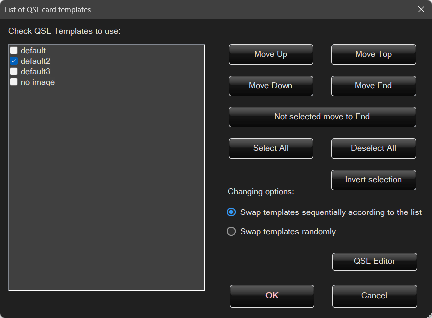 By selecting Instead of a single template, cycle through QSL cards from the list, the program will rotate through QSL card templates automatically.