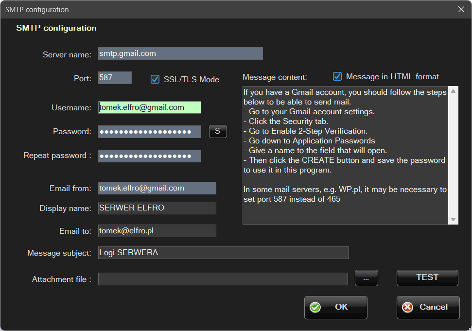 However, to perform a test, the program additionally requires the To e-mail address and the Message content fields.