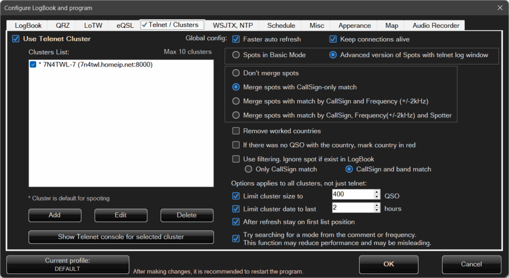 If this option is disabled and you click a selected spot in the Logbook list, the program will remember the selected position and, after refreshing cluster data, return to the same place (if possible).