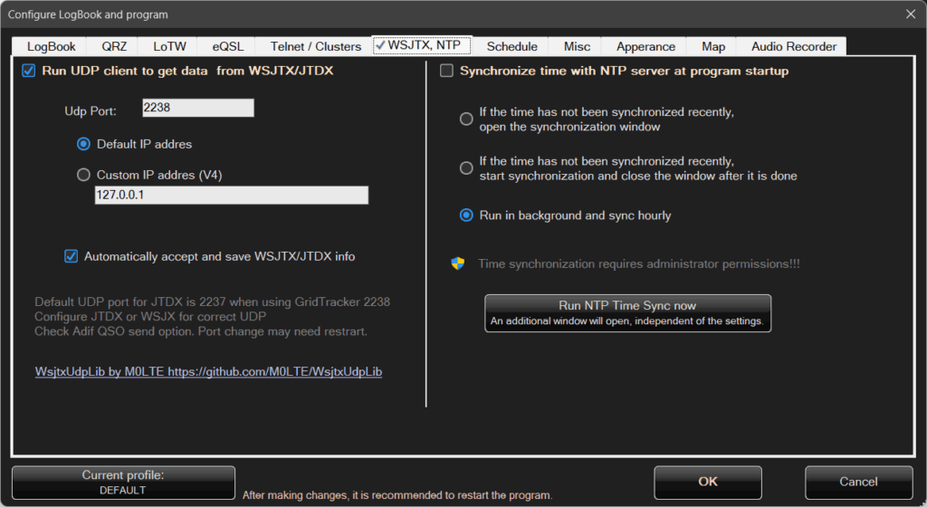 Here you configure the UDP port, IP address, and whether incoming data from WSJT-X / JTDX should be accepted automatically.