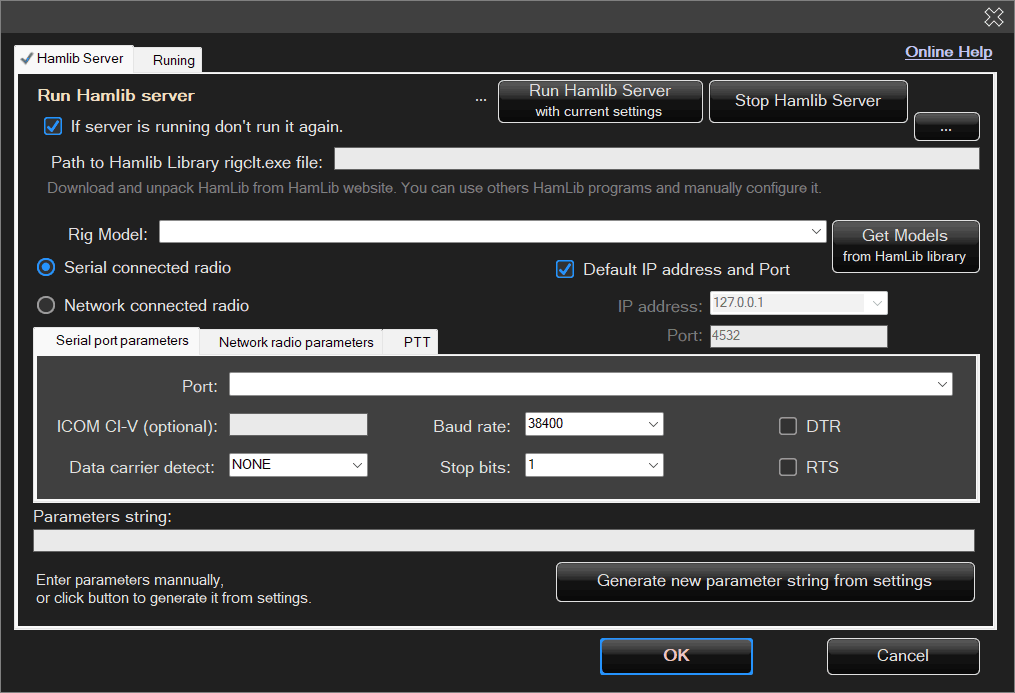 These parameters define which radio rigctld.exe will communicate with and how this communication is performed.