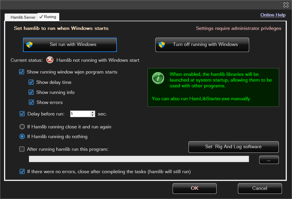 Hamlib also cannot start itself automatically or install itself as a system service (for example, to start together with Windows).