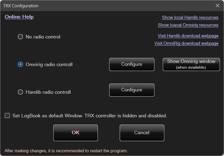 When selecting radio control via OmniRig, you can click Show OmniRig window (if available).