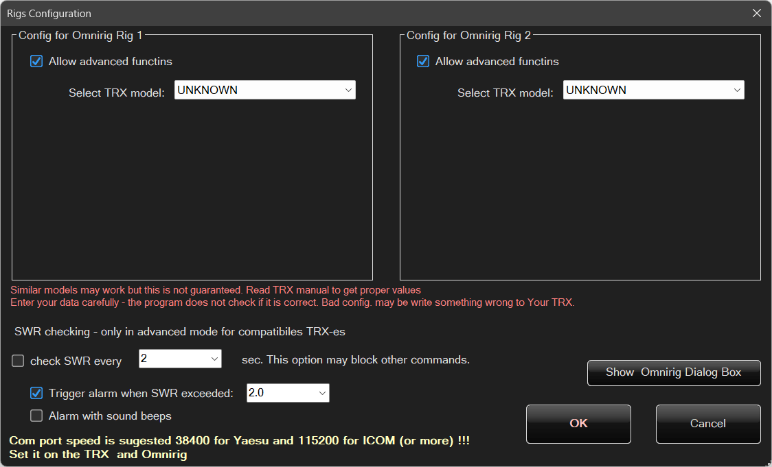 Here you configure the devices for Rig1 and Rig2 Omnirig respectively. Changing your Rig will also automatically change your device.