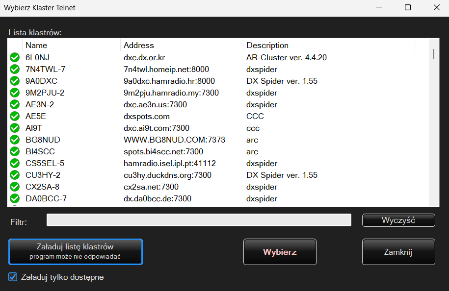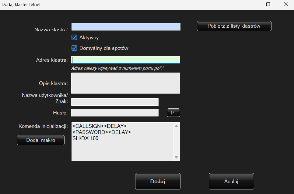 Program obsługuje max. 10 klastrów. Po lewej stronie jest lista do której możemy dodać, usunąć bądź edytować kolejne klastry telnet.