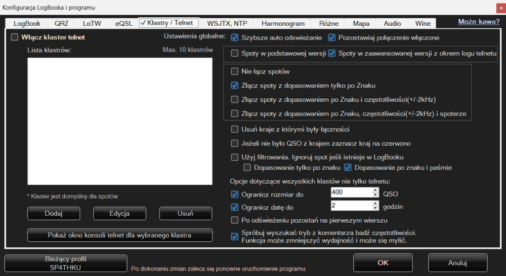 Po odświeżeniu pozostań na pierwszym wierszu – jeżeli opcja jest odznaczona gdy klikniemy w wybrany spot na liście w LogBooku to program zapamięta gdzie kliknęliśmy i po odświeżeniu danych z klastrów wróci w to samo miejsce gdzie było kliknięte (o ile będzie to możliwe). Gdy zaznaczymy tę opcję to każde odświeżenie przesunie nas na początek listy.