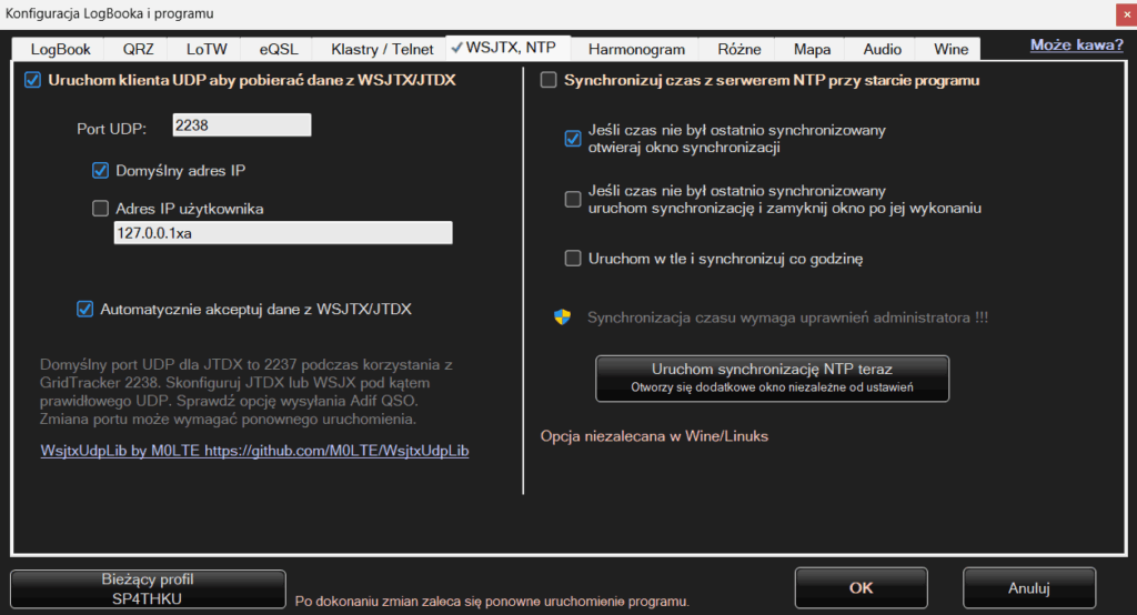 Programy typu WSJTX/JTDX obsługują cyfrowe transmisje np FT8. Mogą one automatycznie wysyłać dane do takich programów jak ten LogBook a łączności mogą się automatycznie zapisywać w Logu. Konfiguracja jest prosta. Po wejściu do konfiguracji szukamy zakładki WSJTX,NTP