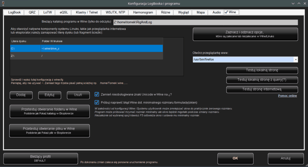 Jeśli RigAndLog korzysta z portów COM (np. dla CW), trzeba zmapować je w Wine: