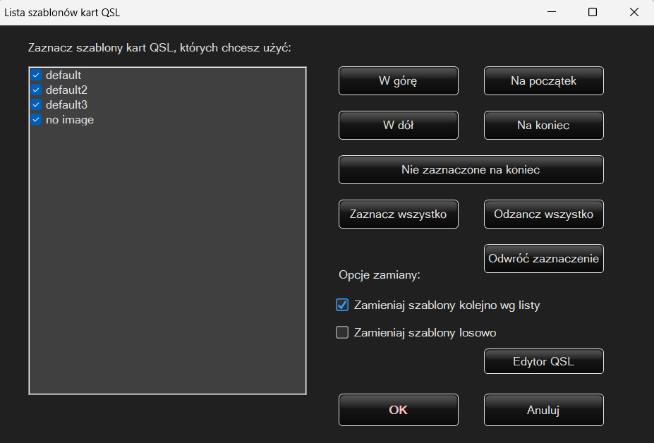 Wiadomość email składa się z dwóch szablonów. Szablonu wiadomości email oraz szablonu karty QSL. Ustawialiśmy i konfigurowaliśmy już je w opcjach powyżej. Można to zrobić także tu klikając w odpowiednie przyciski. Jeżeli mamy wiele szablonów możemy teraz wybrać z listy którego chcemy używać. Ale załóżmy że użytkownik ma np 50 szablonów i chce wysyłać losowo do rozmówców do każdego inny szablon. Zaznaczając Zamiast pojedńczego szablonu wybieraj kolejno karty QSL z listy. Program będzie zmieniał kolejno karty QSL a jak ma to zrobić można zdefiniować po kliknięciu w Edytuj Listę: