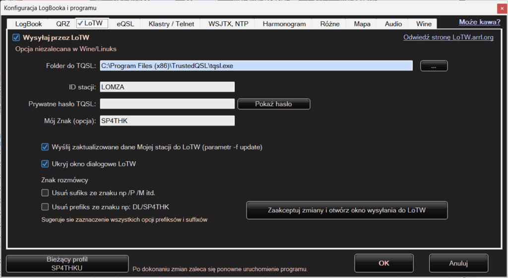 Tu konfiguracja ma mniej opcji. Aby móc wysyłać logi przez LoTW należy zainstalować program TQSL. Zatwierdza on łączności certyfikatem i wysyła je w bezpieczny sposób na serwer. Należy podać lokalizację pliku tqsl.exe i dane logowania oraz stacji.