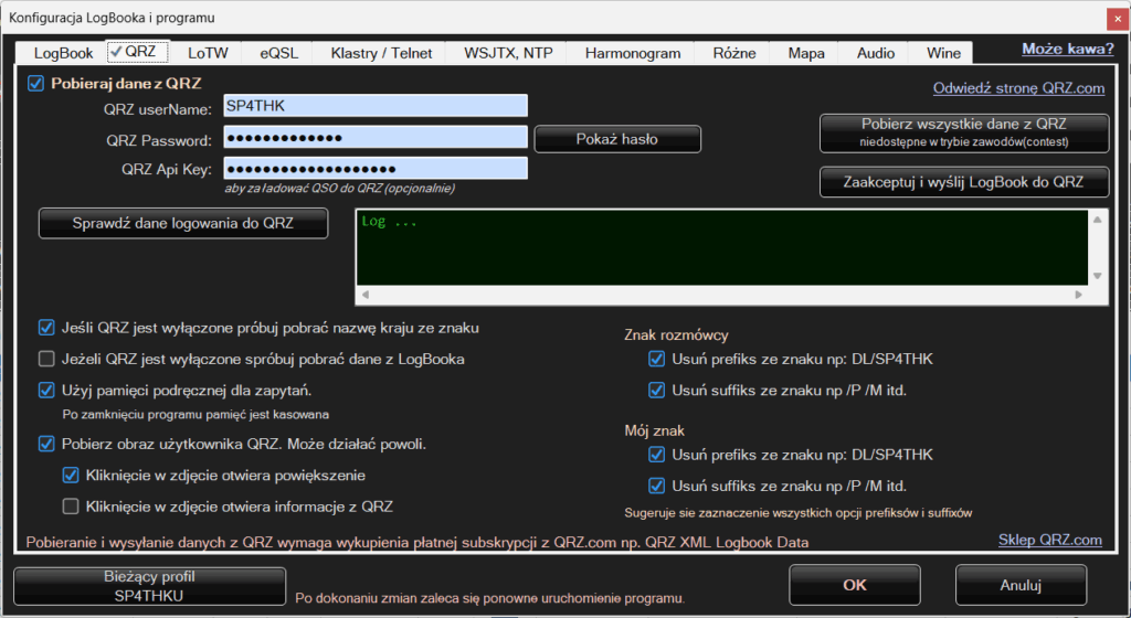 Aby to było możliwe użytkownik musi mieć wykupioną subskrypcję oraz musi wygenerować api key na stronach QRZ. Api wpisujemy w konfiguracji LogBooka.
