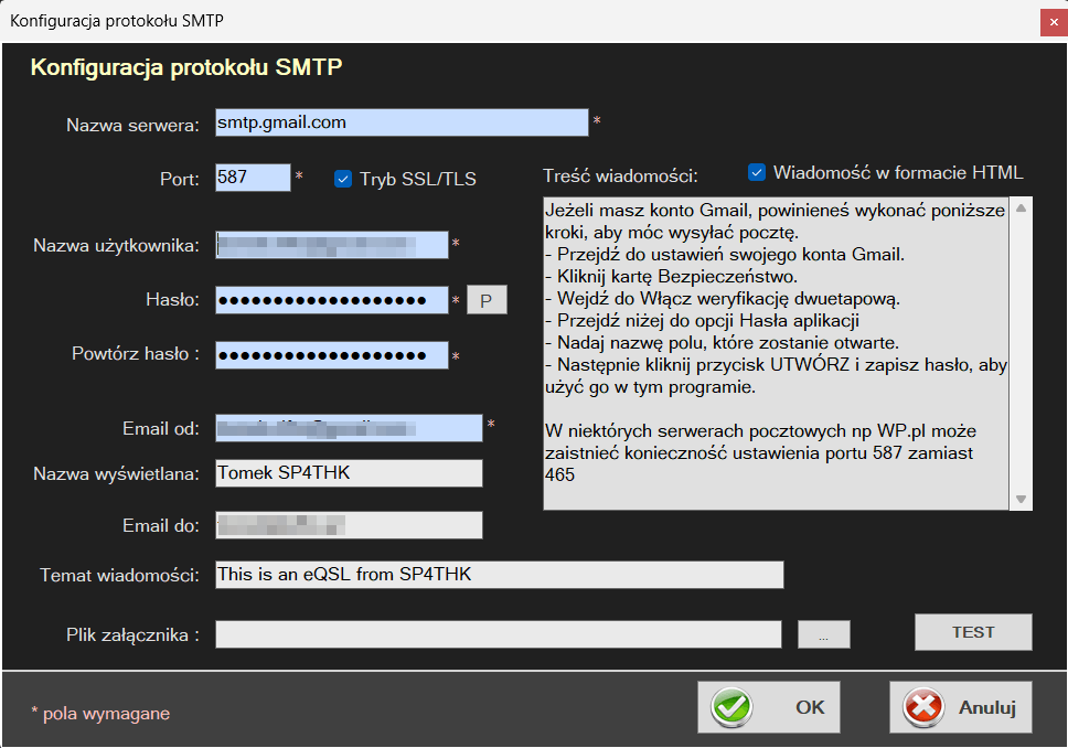 Na czerwono podświetlone są pola które są wymagane. Jednak do wykonania testu dodatkowo program potrzebuje pól Email do i Treść wiadomości.