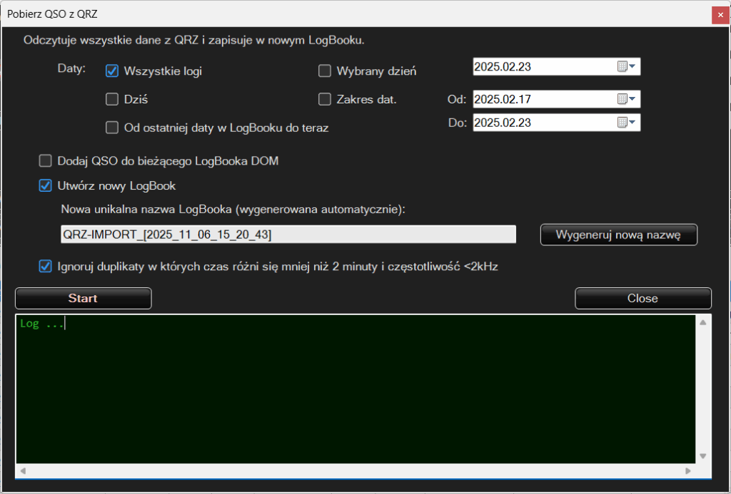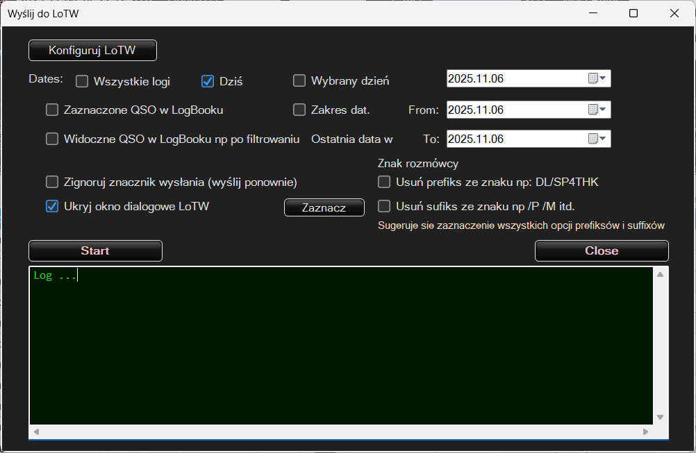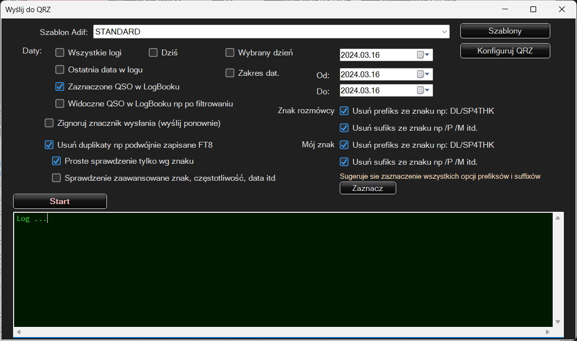 Należy wybrać zakres wysyłanych QSO: wszystkie, czy według daty czy widoczności/zaznaczenia