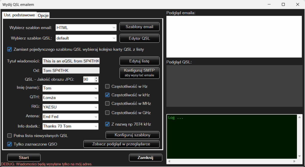 Kolejno należy wybrać szablon email, który może od razu podpowiadać jaki szablon QSL do niego zastosować jednak można to zmienić. Wybieramy tytuł wysyłanego emaila oraz nazwę wyświetlaną Od: (od kogo). Czasem w niektórych skrzynkach nazwa od musi być adresem email nadawcy(naszym)