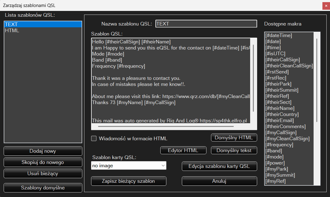 Mamy dwa domyślne szablony TEXT i HTML . Możemy je edytować usuwać i dodawać własne. Po prawej stronie jest lista makr. Można też zaznaczyć szablon karty QSL. Jest to sugerowana domyślna wartość dla szablonu którą można zmienić w głównym oknie programu przed wysłaniem maila.