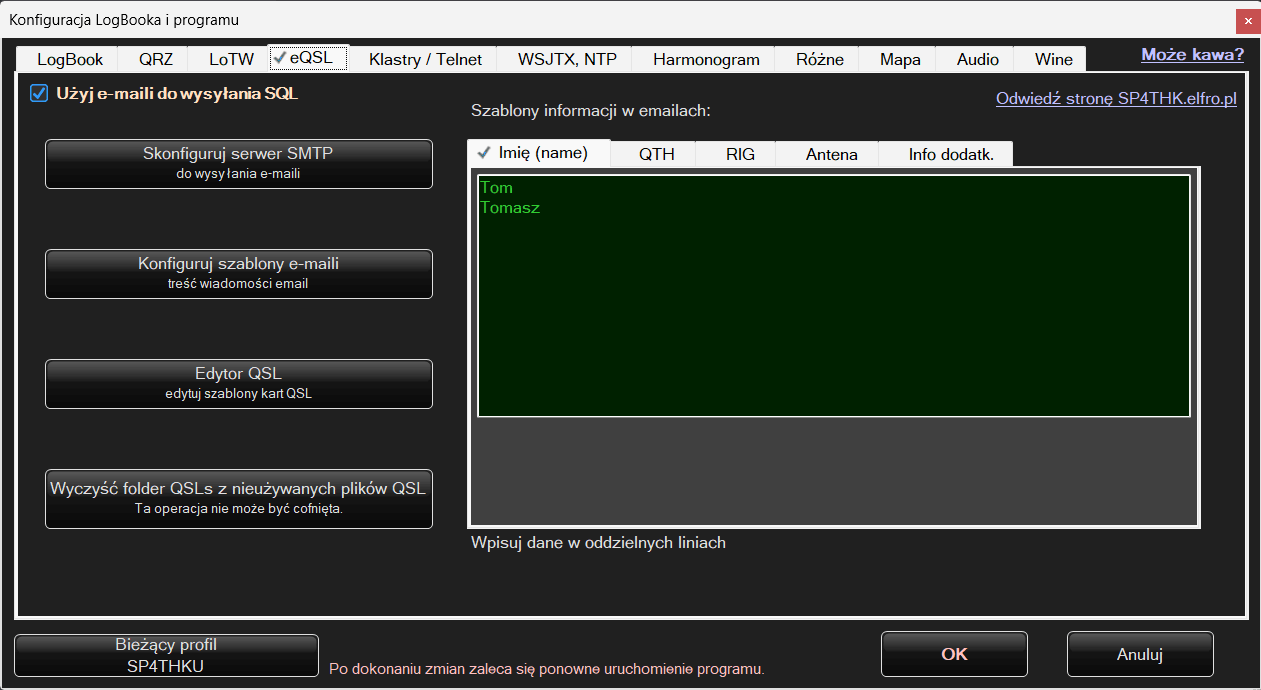 Po prawej stronie są szablony informacji w emailach. Wpisujemy w nich swoje Imię/Imiona lokalizacje, Radia Anteny i ewentualne informacje dodatkowe. Będą one później w polach wyboru przed wysłaniem emaila np będzie można wybrać radio i antenę. Każda linia tekstu to jedno pole wyboru nie można będzie wybrać kilku linii/opcji na raz.