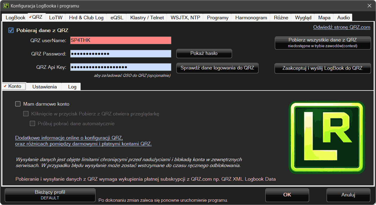 Dodatkowo możemy wpisać swój API Key. Jest to opcja płatna w QRZ. Dzięki temu program będzie mógł wysłać/pobierać listę QSO z LogBooka na serwer QRZ.