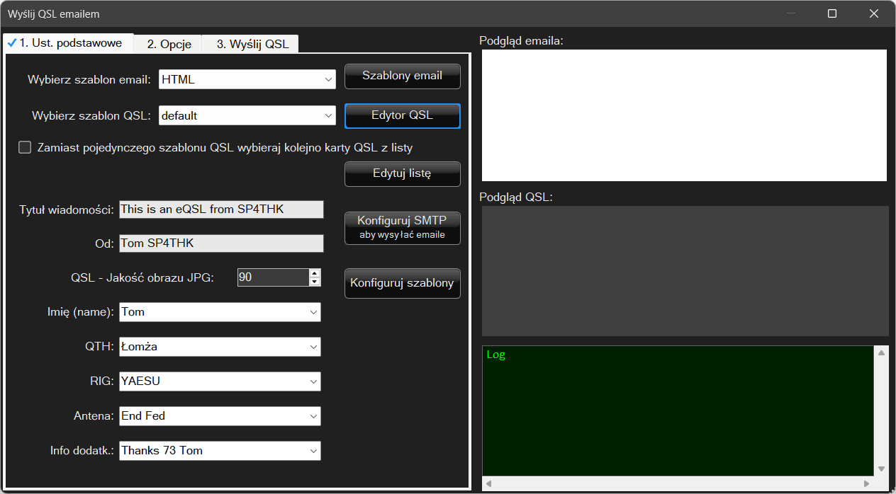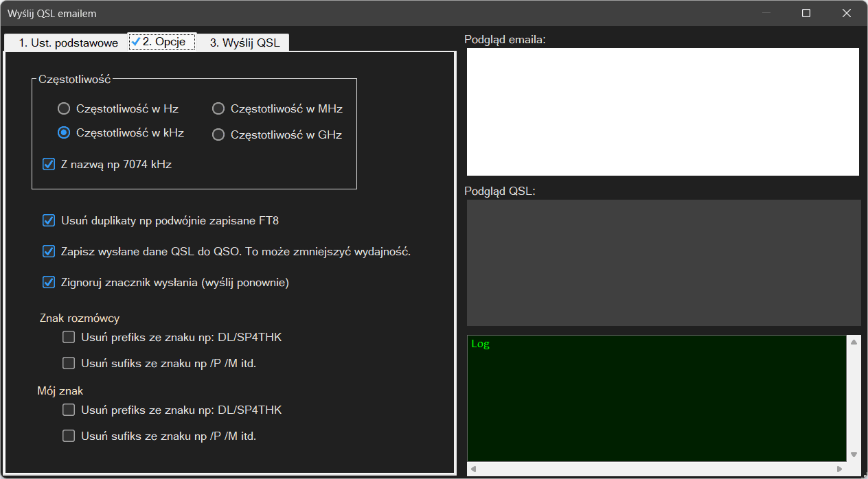W oknie mamy trzy zakładki konfiguracyjne. Ustawienia podstawowe, Opcje i Wyślij QSL