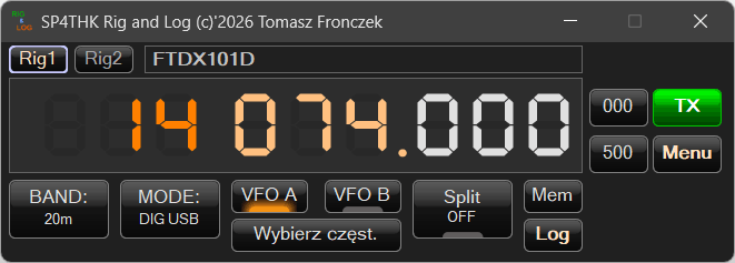 Na górze jest nazwa wybranego RIG z omnirig, lub alias(nazwa) połączenia hamlib. Poniżej jest częstotliwość radia .