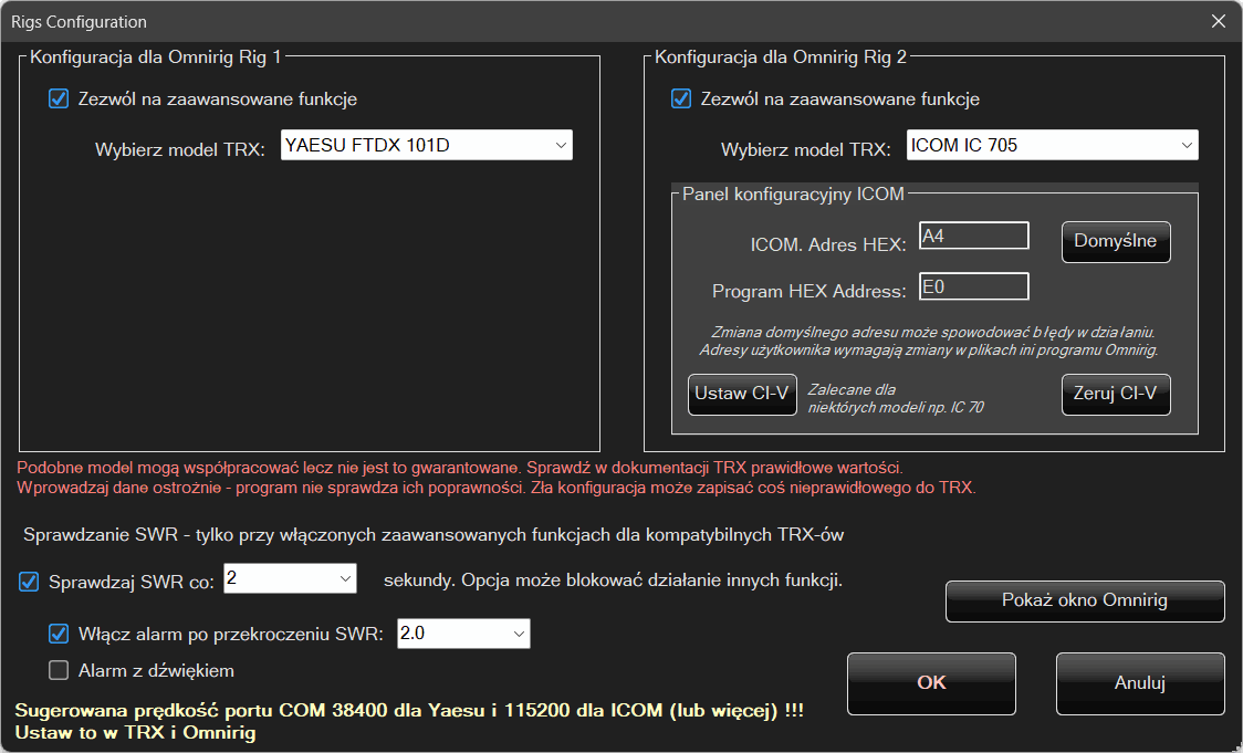Włączanie i wyłączanie transceivera są funkcjami które nie gwarantują 100% sukcesu. Zależy to od kilku czynników windowsa, urządzeń itd. Stąd pojawia się ostrzeżenie przed ich użyciem, że mogą nie zadziałać. A także po ich uruchomieniu może być konieczny restart programu omnirig. (CTRL-F3 iOK)